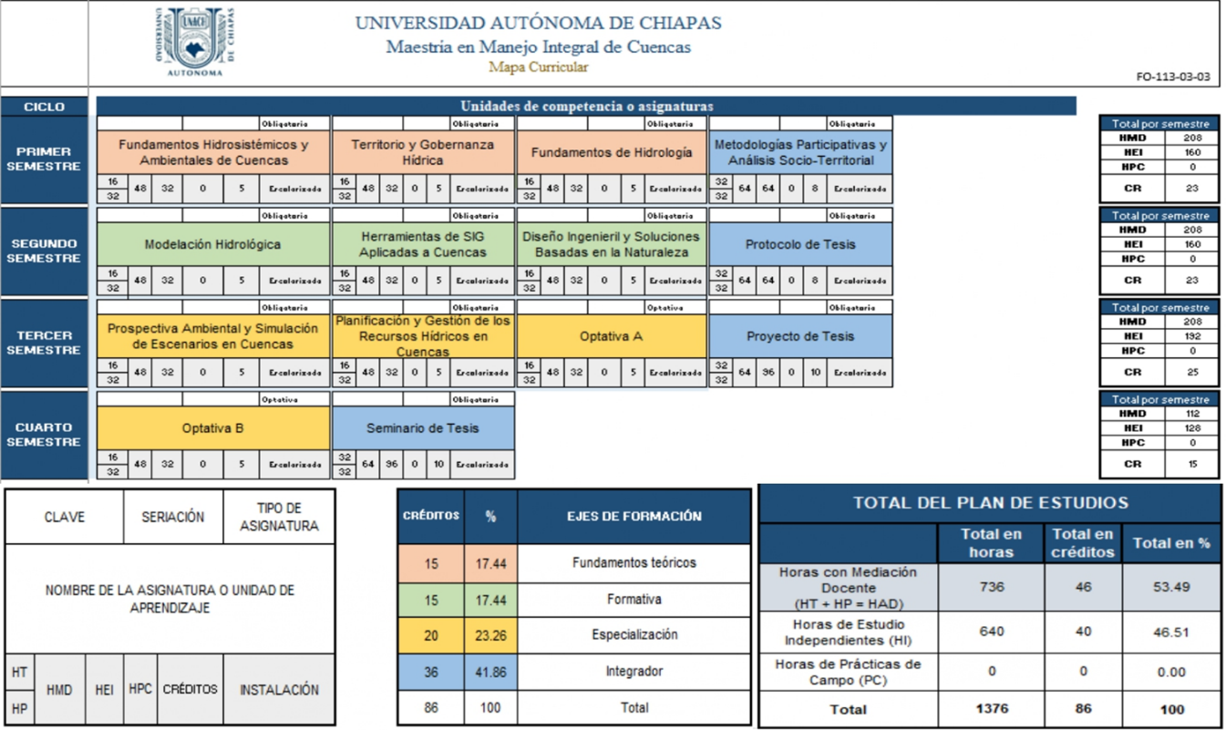 El plan y programa de estudios de la Maestría en Manejo Integral de Cuencas es un programa profesionalizante el cual comprende 4 semestres de trayectoria académica con una duración de 2 años, con 12 unidades de competencia obligatorias y 2 optativas, haciendo un total de 14 unidades. En términos generales el mapa curricular se divide en cuatro ejes de formación.